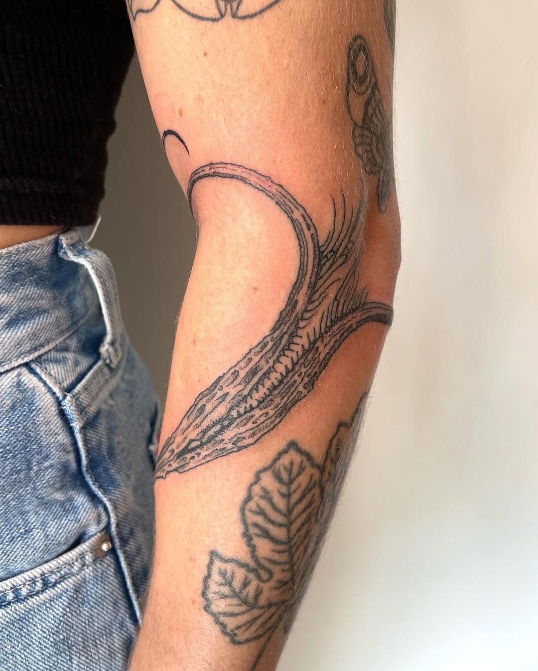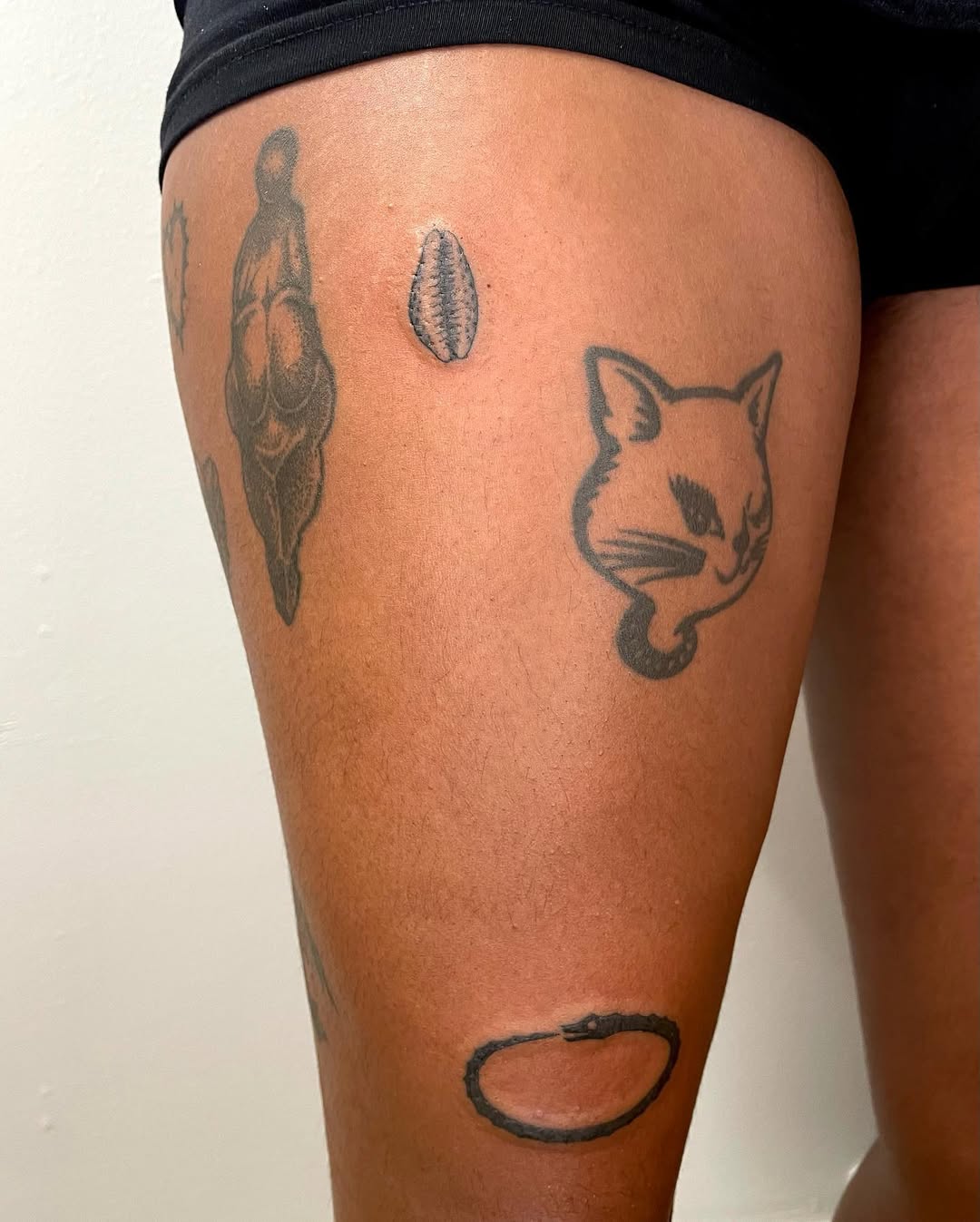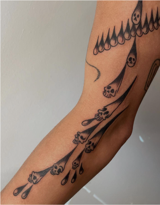 Themes include interdependence, weird nature, death/birth, psychedelia, extreme text, and visual puns. Flash is one of one and I prioritize drawn-on and/or freehand tattoos.