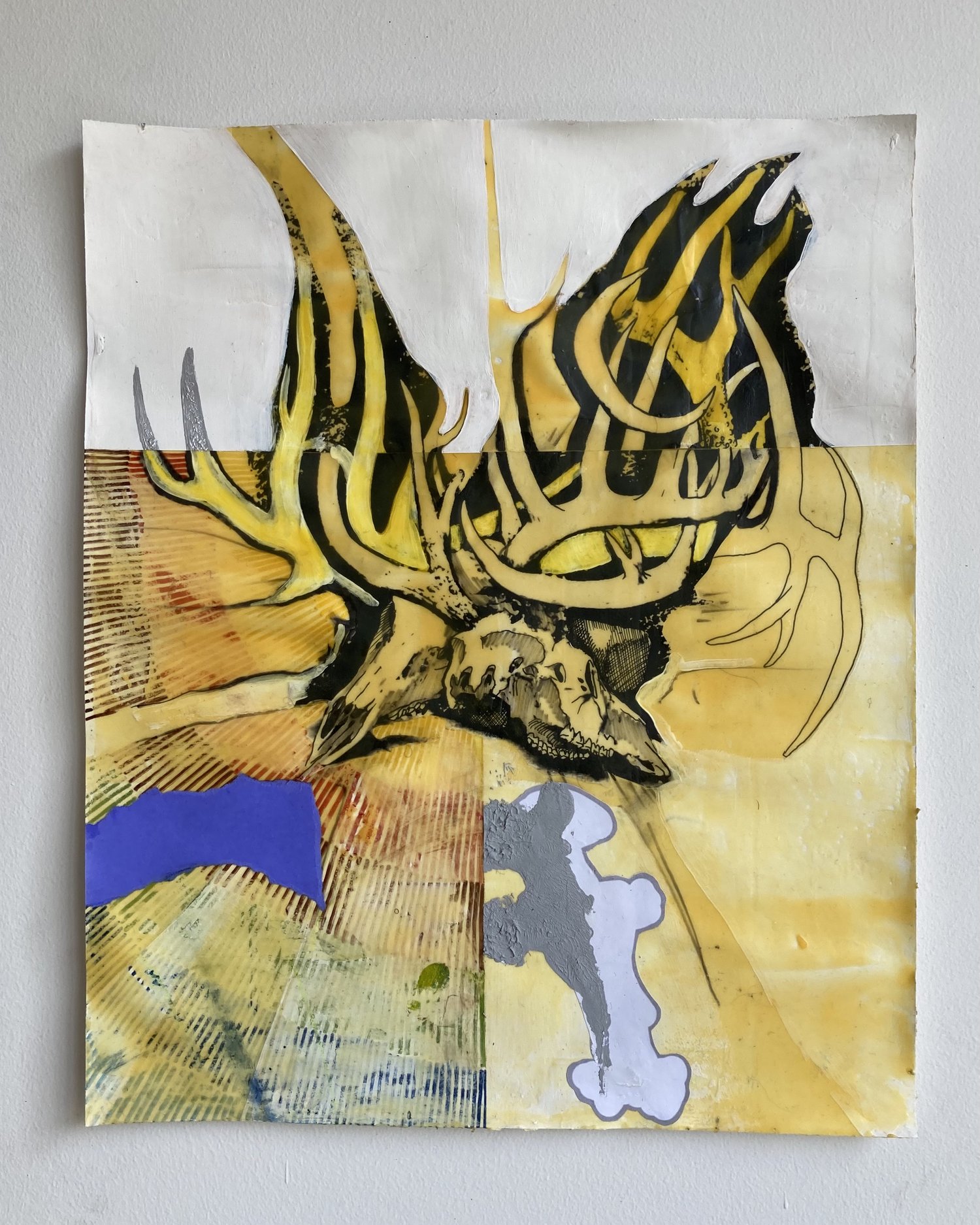 Inkjet print, ink, gesso, wood glue, paper, watercolor, oil paint, & enamel on paper