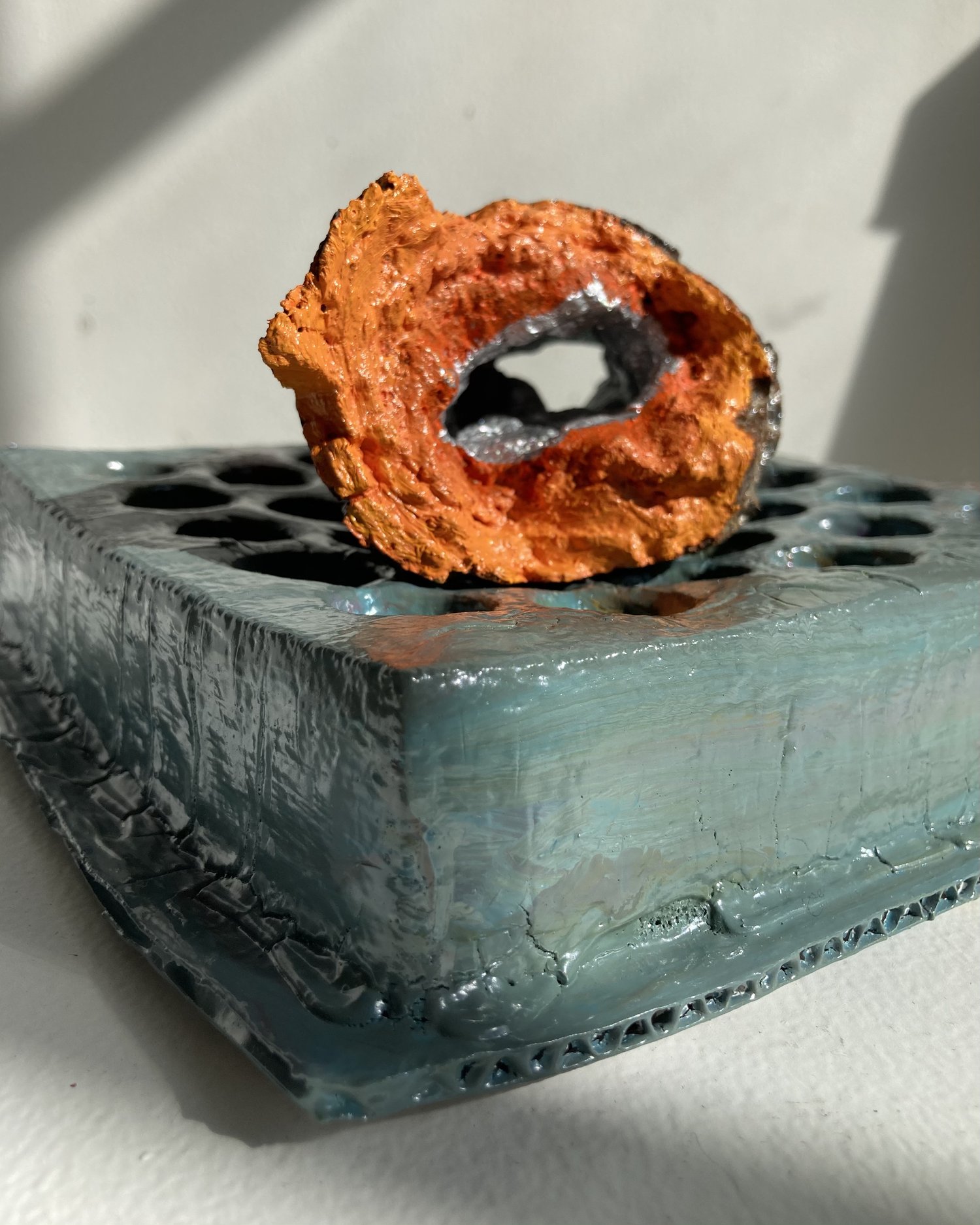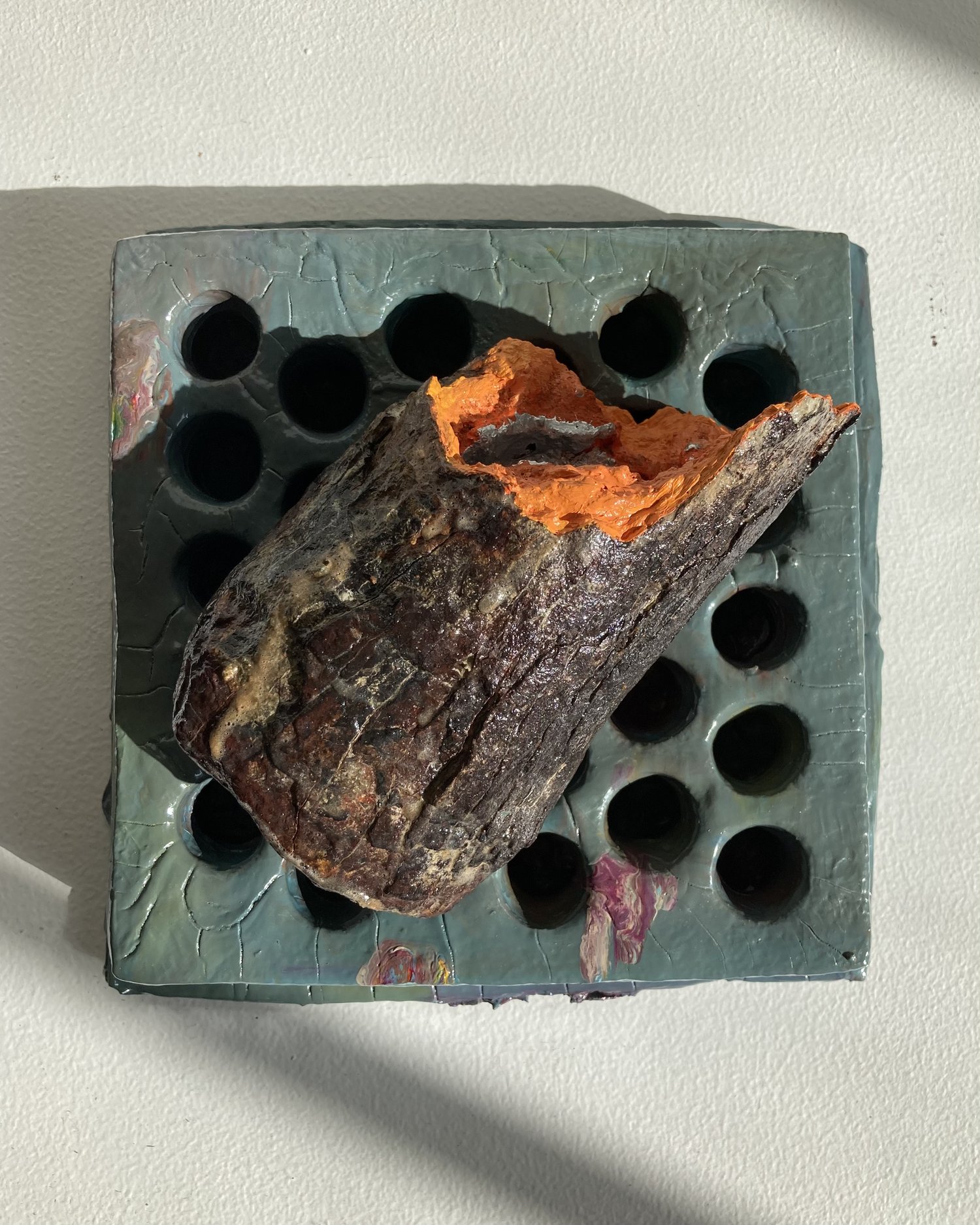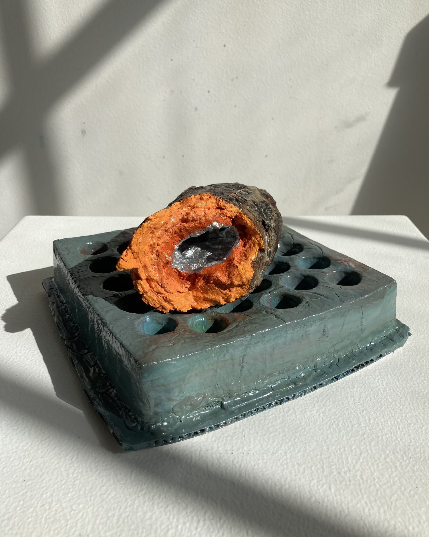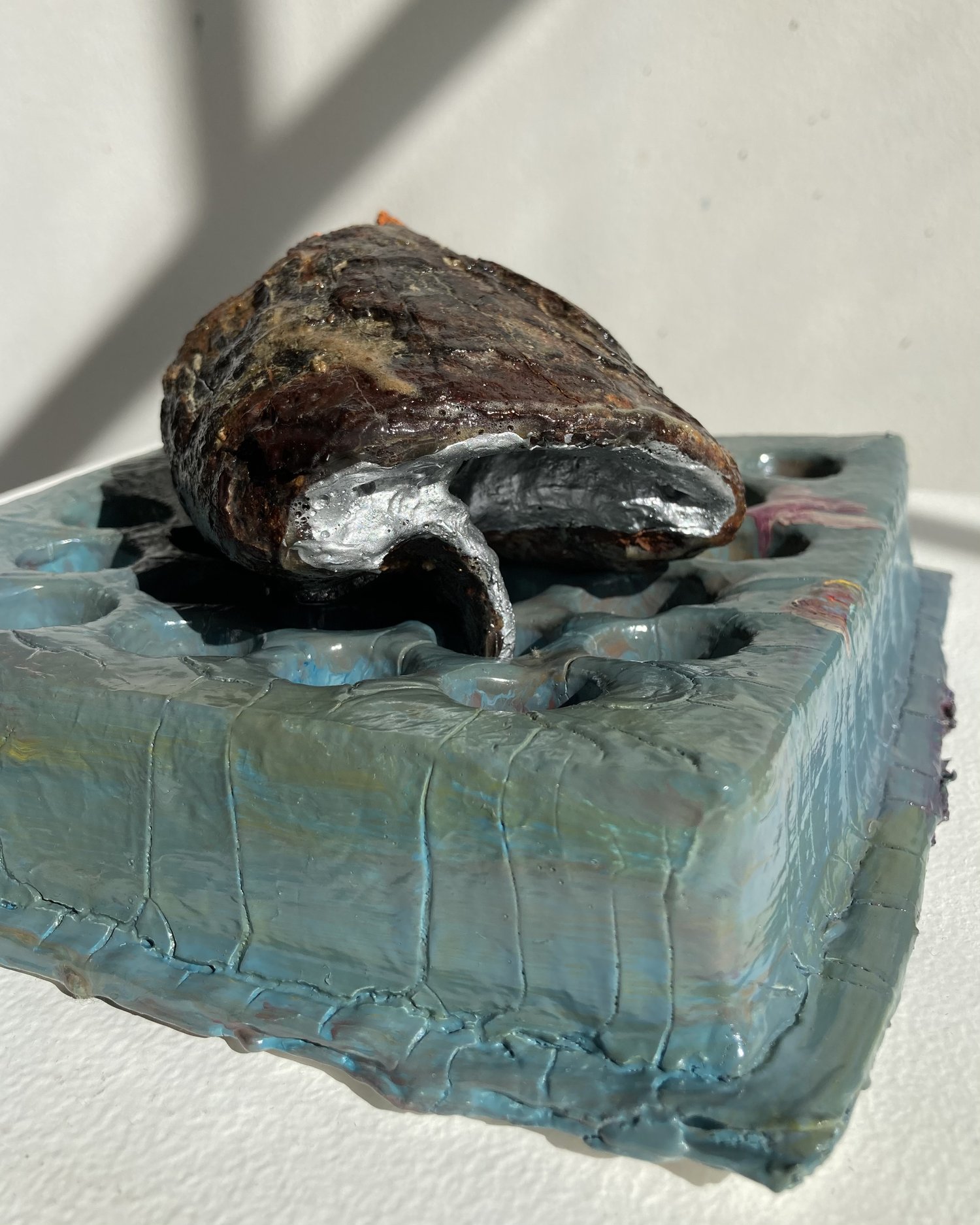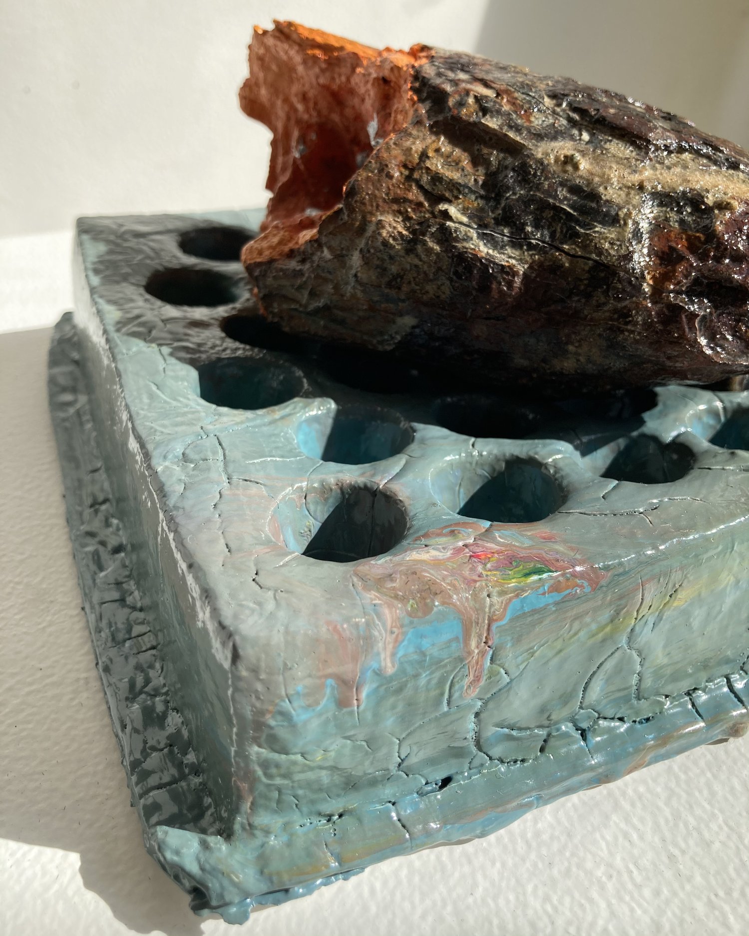 Cardboard, foam, sea trash (metal?), gesso, wood glue, acrylic, house paint, oil, & enamel