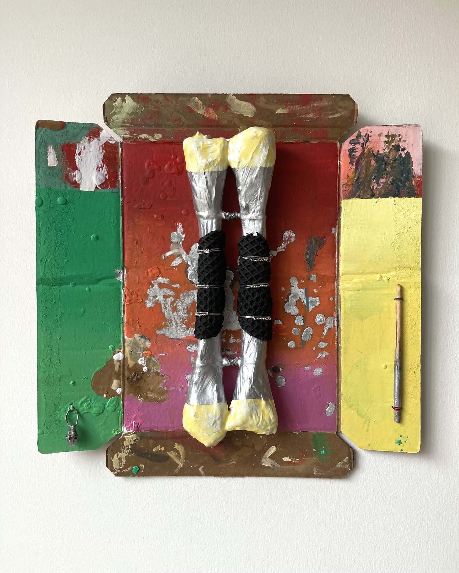 Cardboard, paper tape, gesso, wood glue, enamel, oil paint, rubber, silver wire, thread, brush handle, & found charm