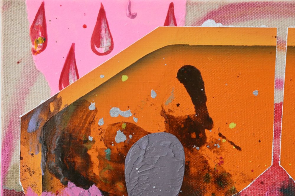 gesso, watercolor, paper, ink, acrylic, oil, enamel, & pastel on canvas with brass upholstery tacks