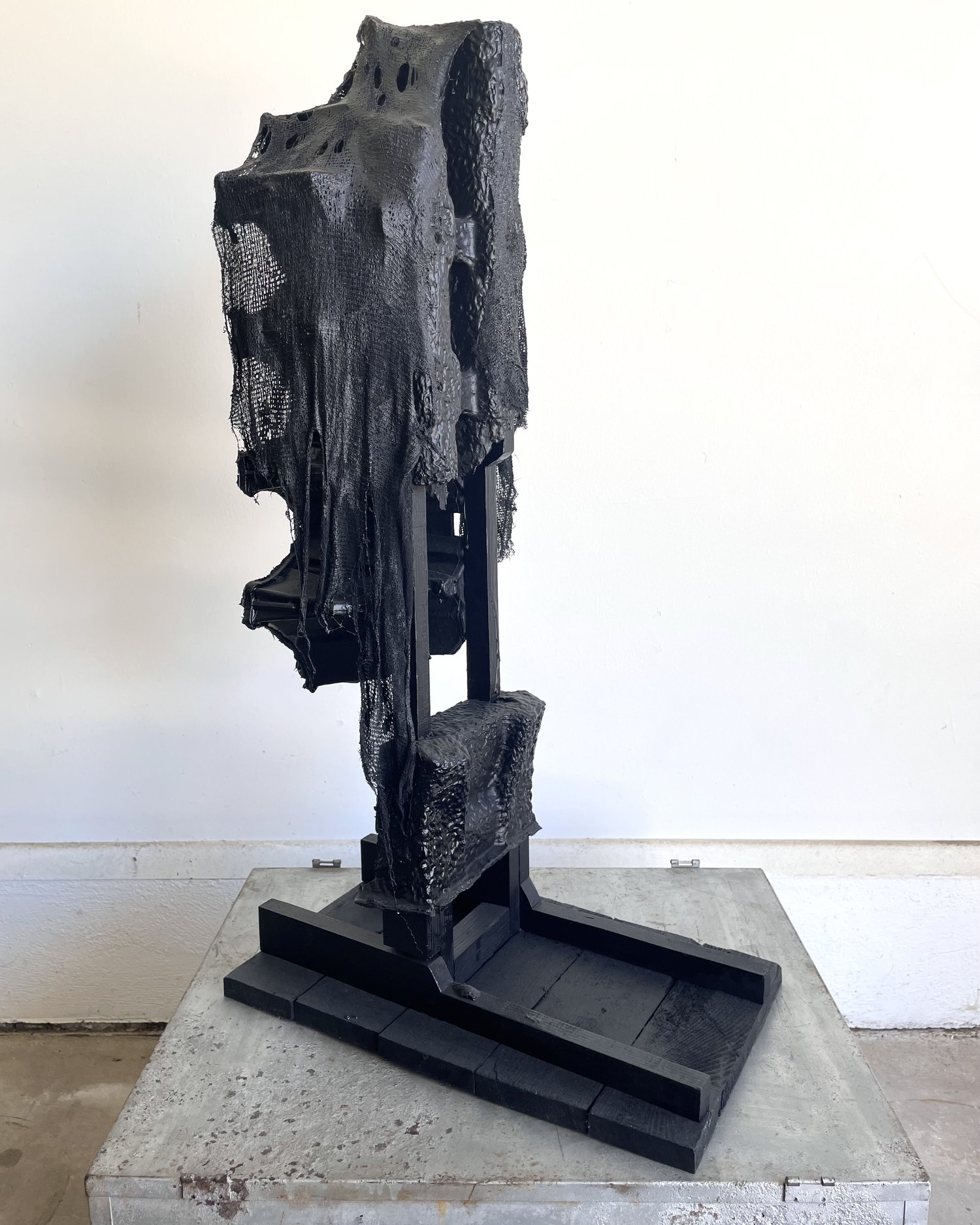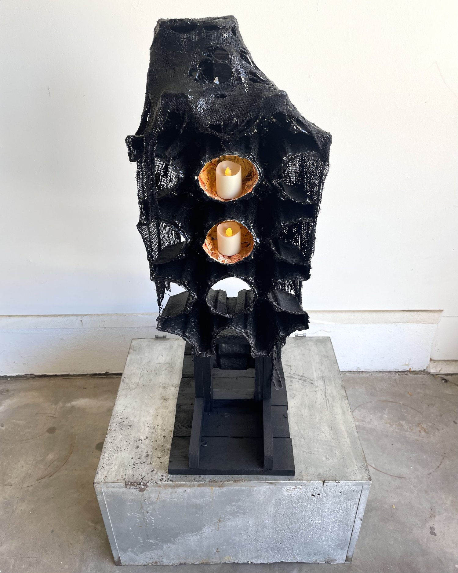 wood, paper packing material, cardboard, gauze, wood glue, gesso, spray enamel, & metal pins