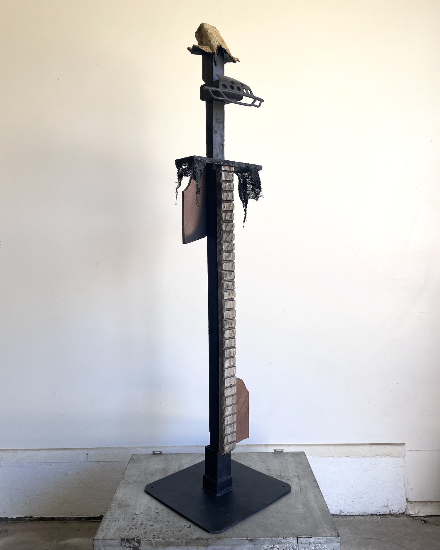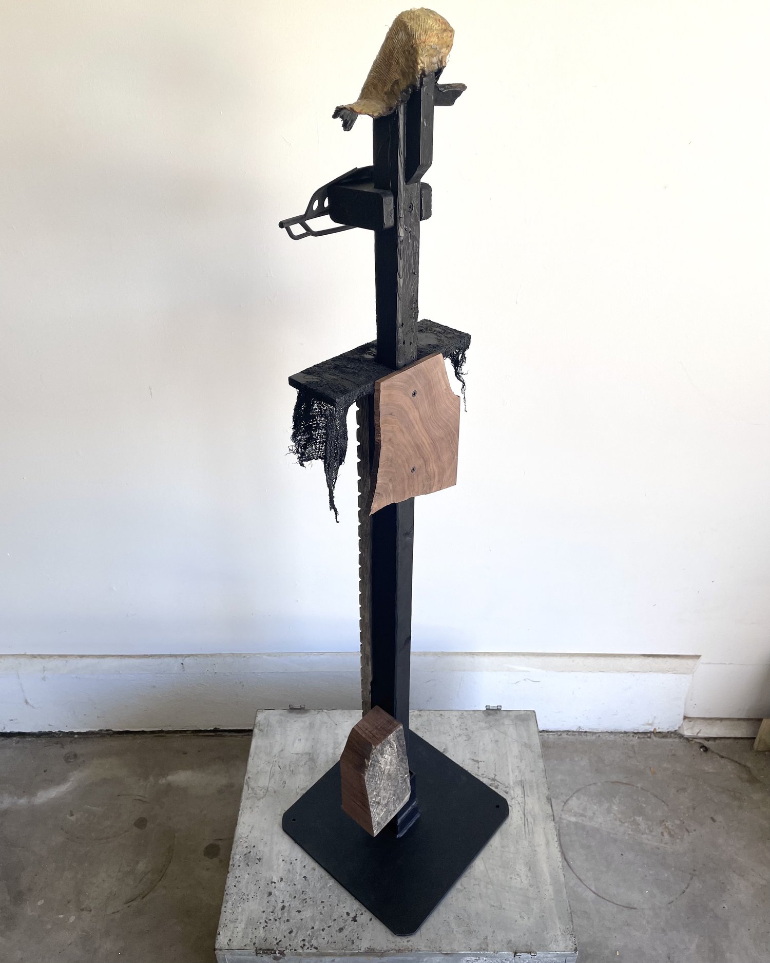 wood (pine, walnut, plywood), gauze, paper packing material, plastic, wood glue, & spray enamel in steel base