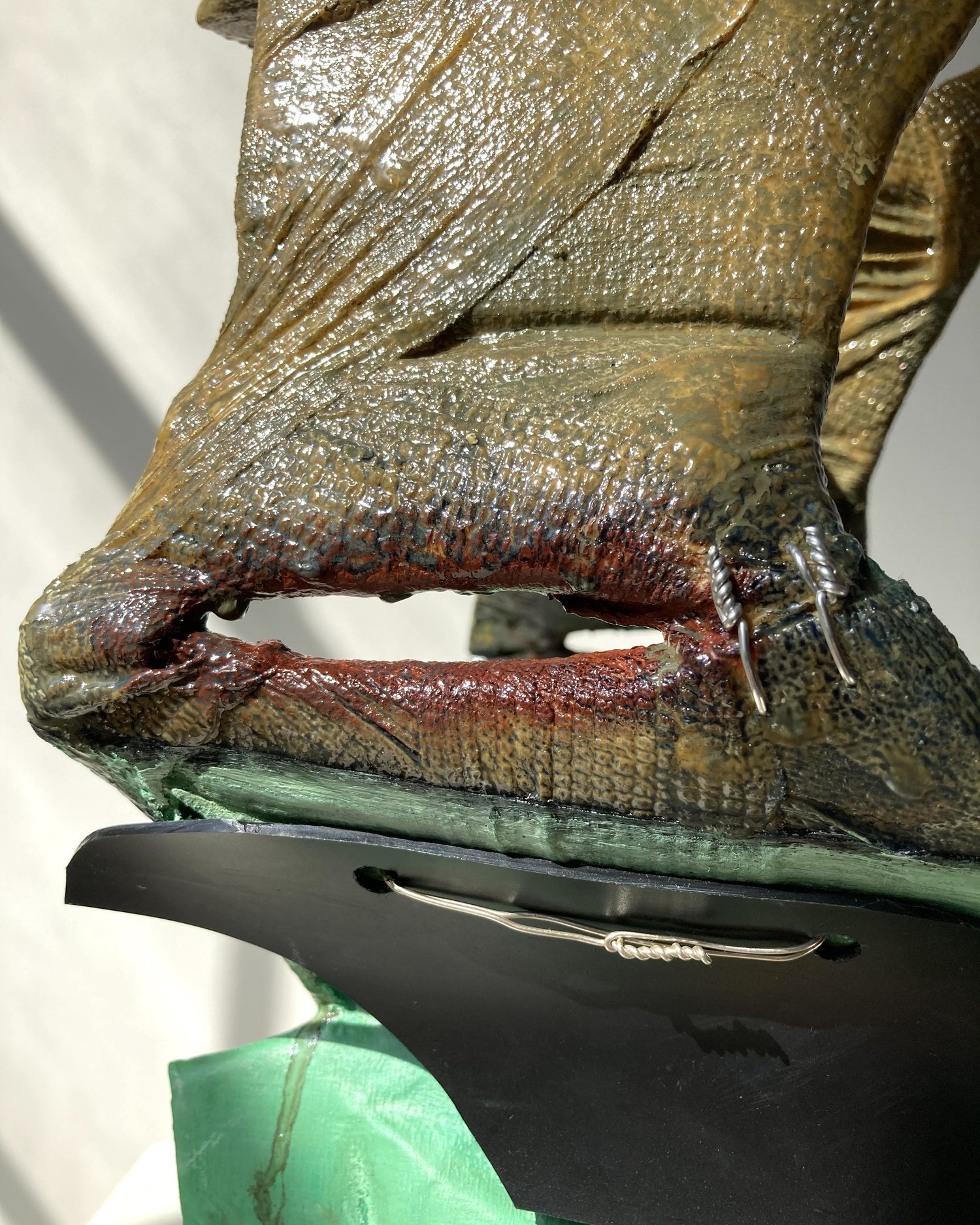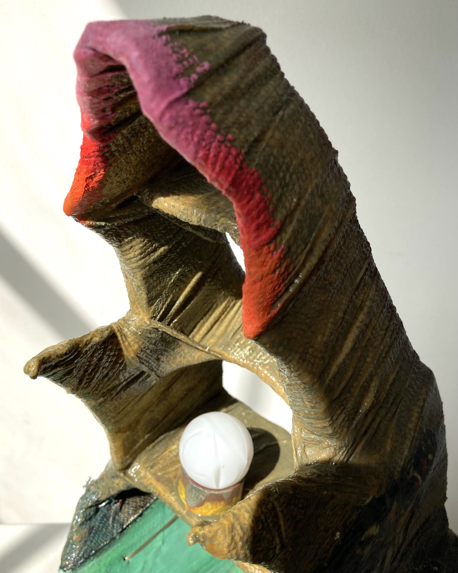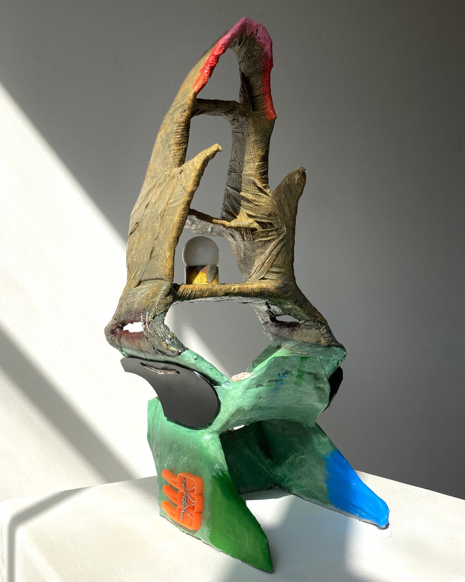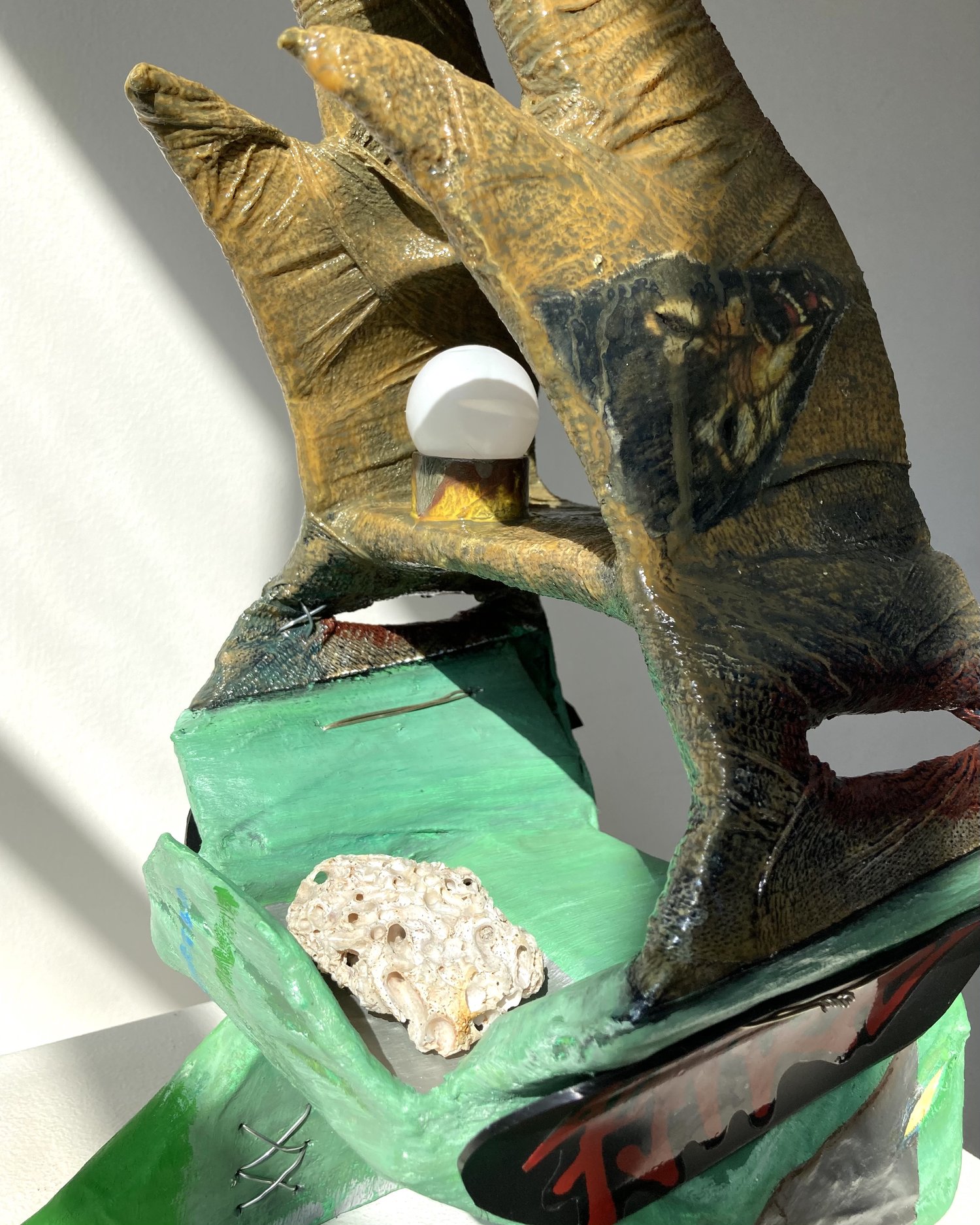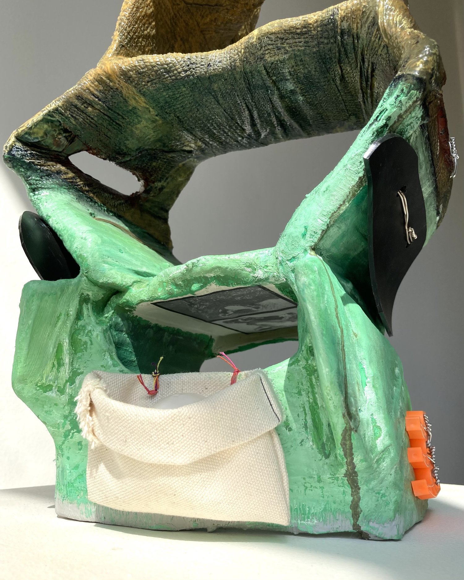 Cardboard, paper tape, self-adherent bandage, wood glue, house paint, gesso, inkjet print, oil paint, enamel, plastic, silver wire, thread, canvas, vermetidae shell, & relic from Mike Kelley memorial performance
