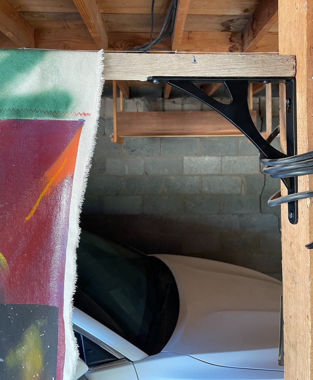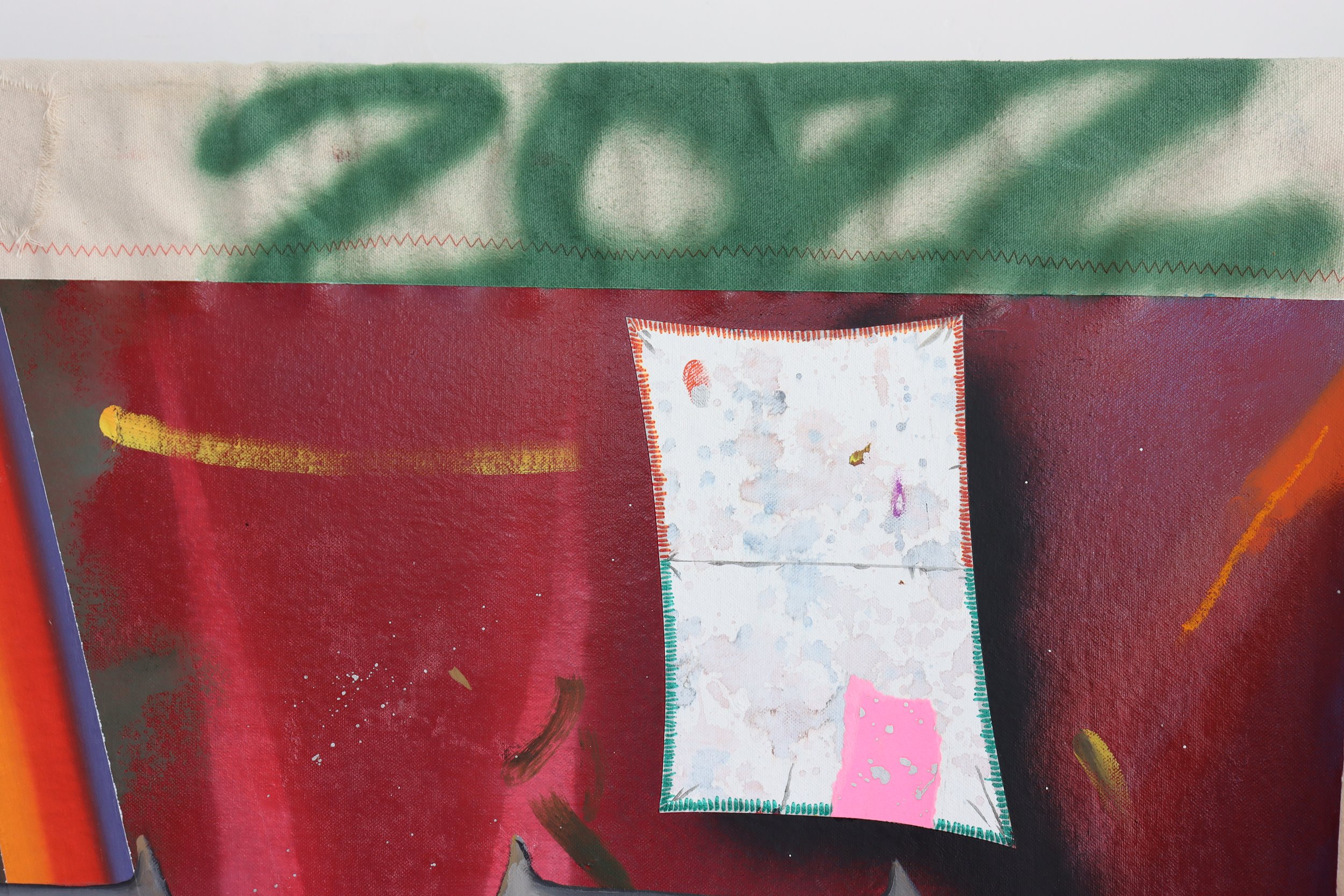 Gesso, paper, synthetic mesh, watercolor, ink, oil, enamel, pastel, thread, & mushroom dongle on canvas with metal and wood hardware