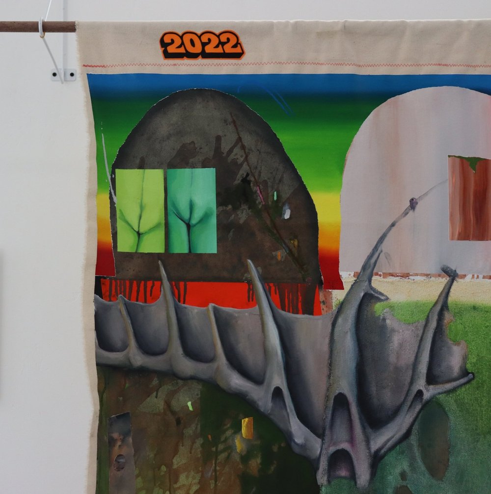 gesso, paper, synthetic mesh, watercolor, ink, acrylic, oil, enamel, pastel, thread, & on canvas with metal and walnut hardware